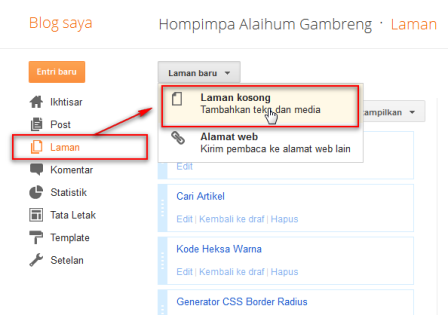 Untuk membuatnya, pertama-tama klik menu Laman pada sidebar. Kemudian, pada menu Laman Baru pilihlah Laman Kosong: