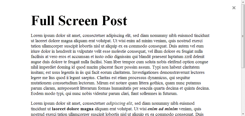 Saya membuat sebuah aplikasi/widget kecil untuk membuat posting di blog menjadi memiliki alternatif tampilan “layar penuh”. Tidak benar-benar layar penuh sebenarnya, karena widget ini hanya bekerja dengan cara menyisipkan tabir baru berisi duplikat judul dan konten posting. Kalau Anda ingin membuat fitur full screen sungguhan yang bisa memenuhi seluruh layar, Anda bisa mempelajari API JavaScript ini ⇒ MDN – Using Full Screen Mode